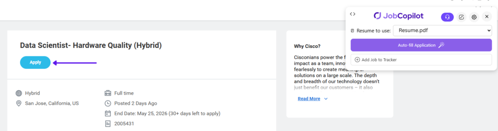 The JobCopilot Chrome Extension helps you complete job applications faster by automatically filling in your details on external job sites.