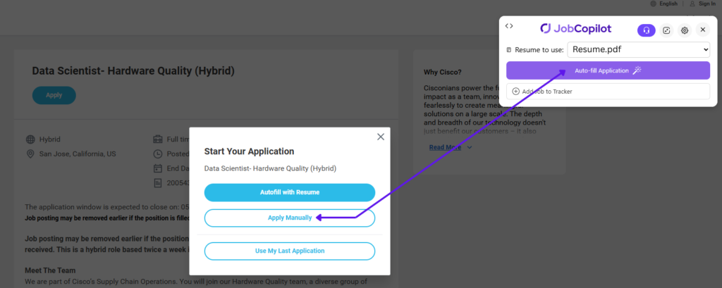 - Select “Apply Manually” (or “Autofill with Resume” if preferred)