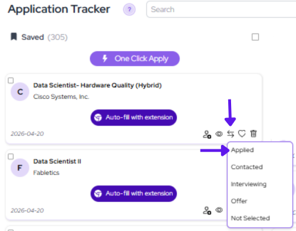 ➡️ Click the “move stage” icon on the job and select the status Applied
