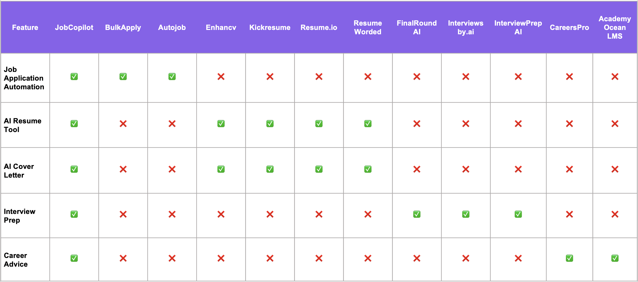 Combinando la automatización de las solicitudes de empleo, Curriculum vitae basado en IA y cartas de presentación, preparación de entrevistas y asesoramiento profesional,JobCopilot elimina la molestia de hacer malabarismos con varias plataformas. Mientras que algunas herramientas profundizan en funciones específicas, las versiones accesibles de JobCopilot suelen ser más que suficientes para ayudarte a empezar y a progresar.