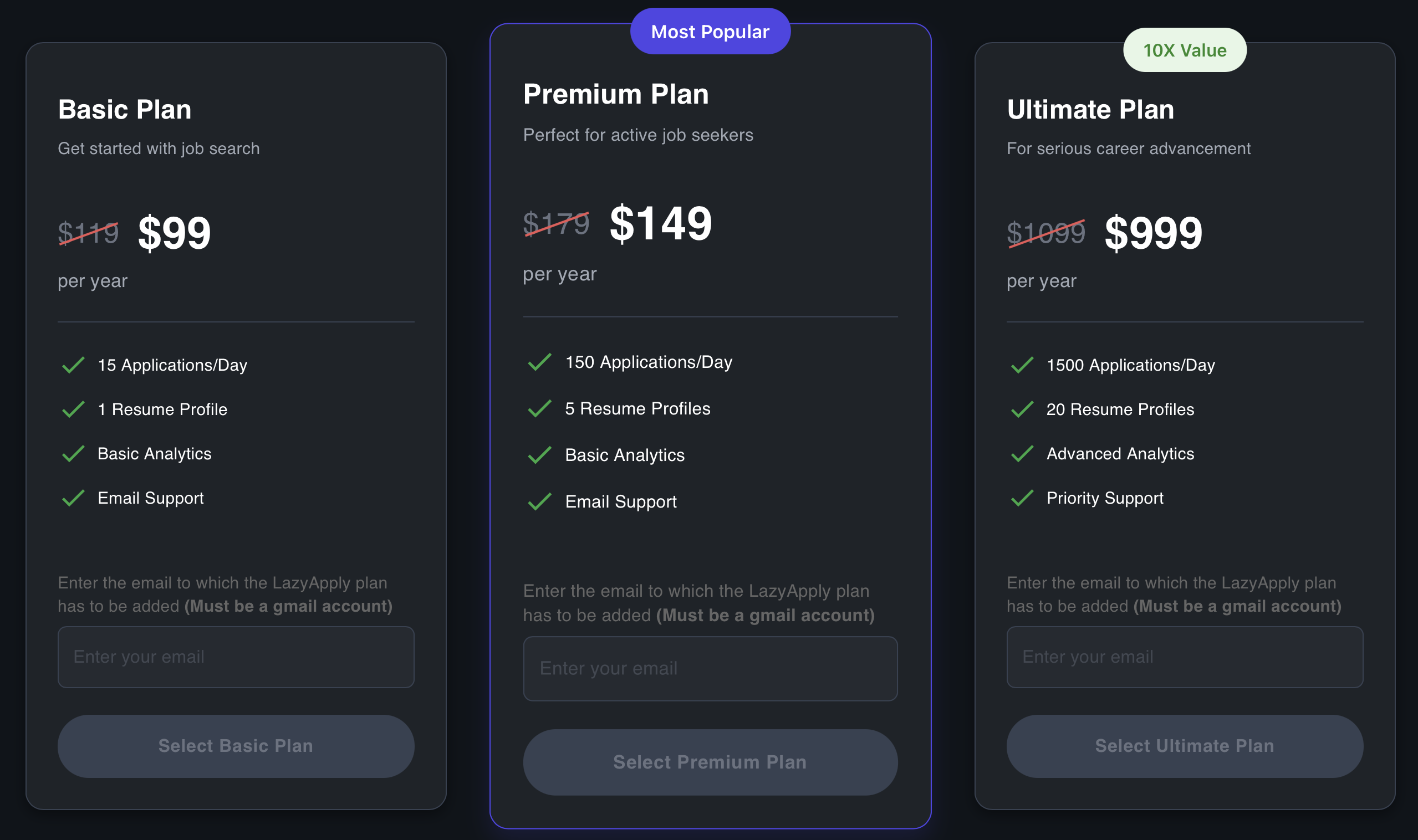 LazyApply opère sur un modèle de paiement unique plutôt que sur la base d'un abonnement. Ils proposent trois niveaux de prix principaux :