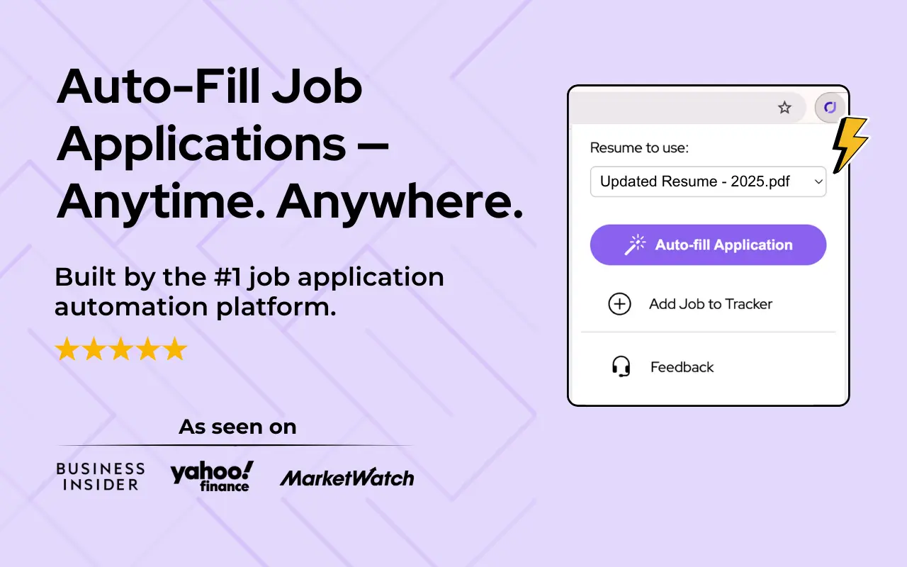 Utilizza il vostro curriculum, i dettagli e le risposte salvate, senza inserimento manuale. Riduce i moduli di 15-20 minuti a pochi clic.