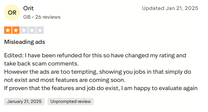 Users feel the platform’s ads set expectations too high. Reviews mention being drawn in by advertised jobs or features, only to find that certain roles weren’t available or that key features were marked as “coming soon.”