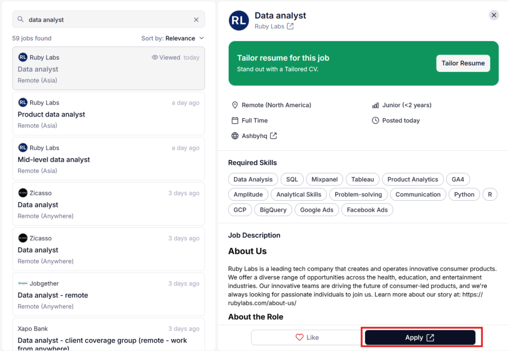 - Built-in application tracker: Every saved or applied role is logged automatically, so nothing slips through the cracks.