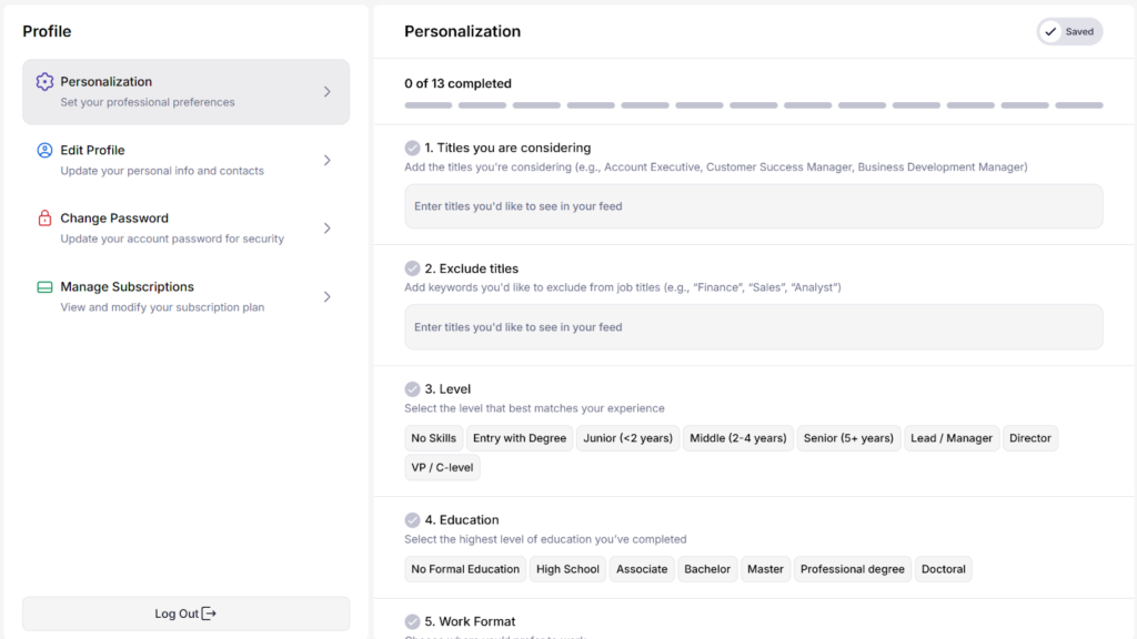 RemoteJobsFinder.co also includes an optional Personalization setup designed to refine job recommendations over time. These fields aren’t mandatory, but the more you complete, the more the platform tries to tailor results to your profile.